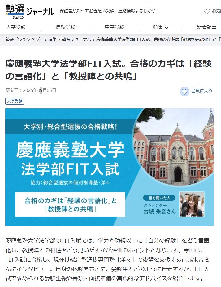 『塾選ジャーナル』に、洋々メンター古城のインタビュー記事「慶應義塾大学法学部FIT入試。合格のカギは「経験の言語化」と「教授陣との共鳴」」(2025年9月5日掲載)が掲載されました。洋々代表 清水のコメントも掲載されています。