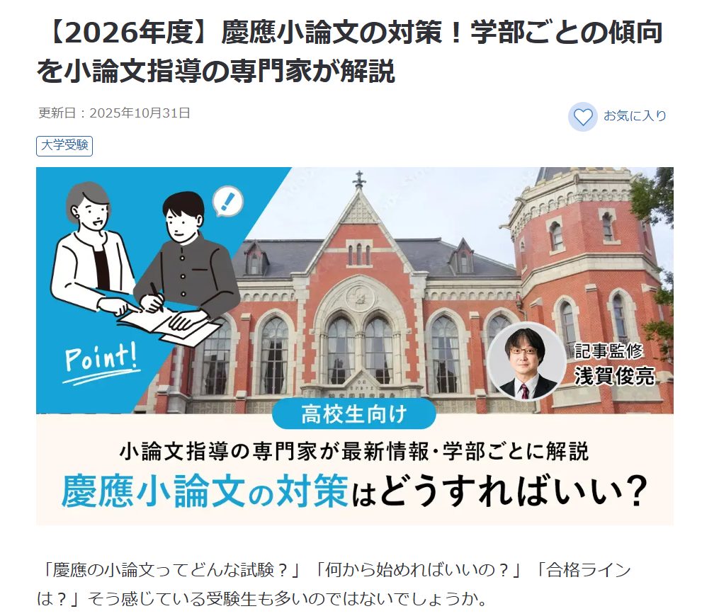 『塾選ジャーナル』に、洋々小論文責任者 浅賀の監修の記事「【2026年度】慶應小論文の対策!学部ごとの傾向を小論文指導の専門家が解説」(2025年10月31日掲載)が掲載されました。浅賀のコメントも掲載されています。