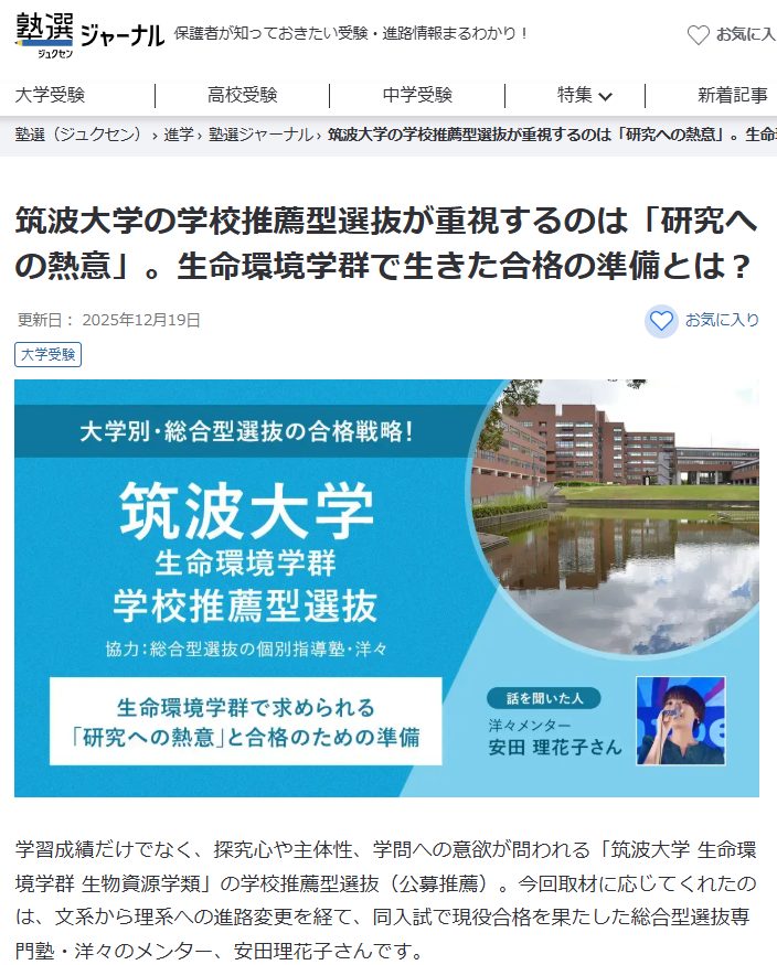 『塾選ジャーナル』に、洋々メンター安田のインタビュー記事「筑波大学の学校推薦型選抜が重視するのは「研究への熱意」。生命環境学群で生きた合格の準備とは?」(2025年12月19日掲載)が掲載されました。洋々代表 清水のコメントも掲載されています。
