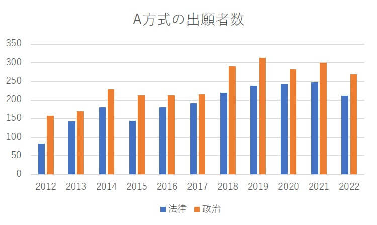 また、2022年は法律学科の合格者数が政治学科の合格者数を僅かながら上回りました。例年、最終合格者数は法律学科よりも政治学科のほうが多いか、両学科ほぼ同数であることがほとんどでしたが、2022年は7年ぶりに法律学科のほうが多くなりました。