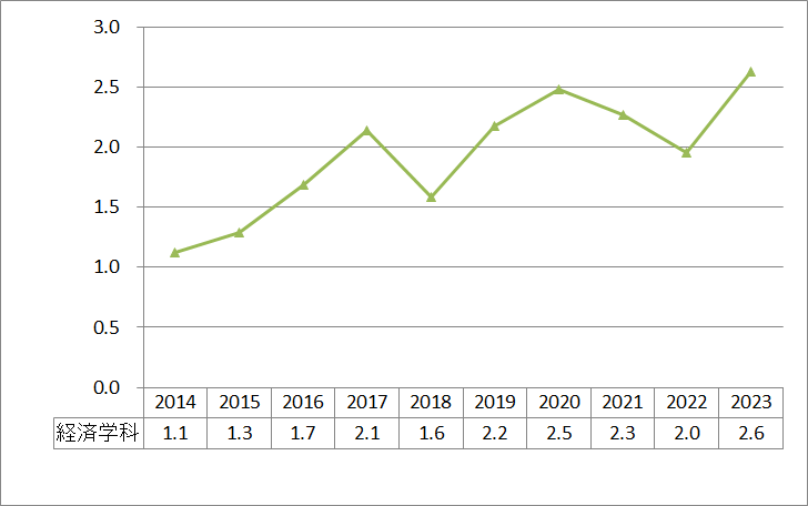 経済学科は2015年度以降、1.3から2.6倍で推移していますが、昨年は2.6倍となり過去10年で最高倍率となりました。