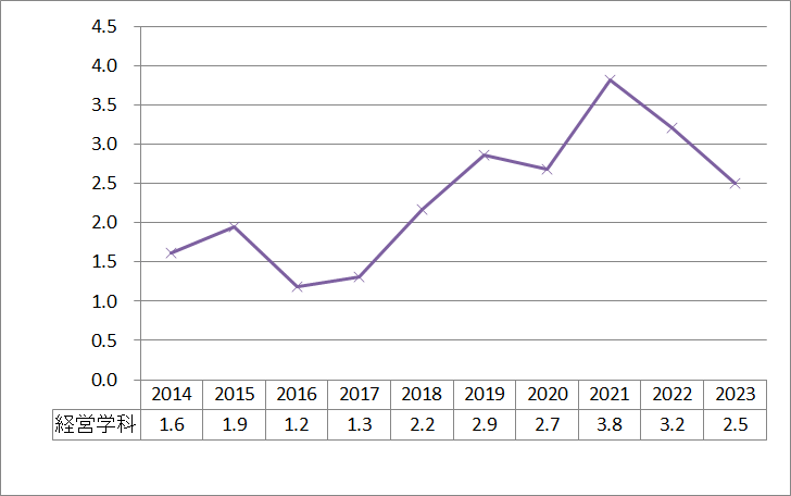 2014から2017年度までは1.2から1.9倍だった経営学科は2018年度から上昇傾向にあり、過去6年間は2.2から3.8倍で推移しています。
