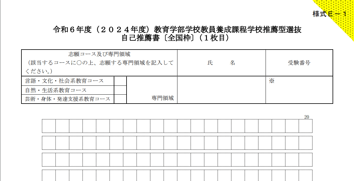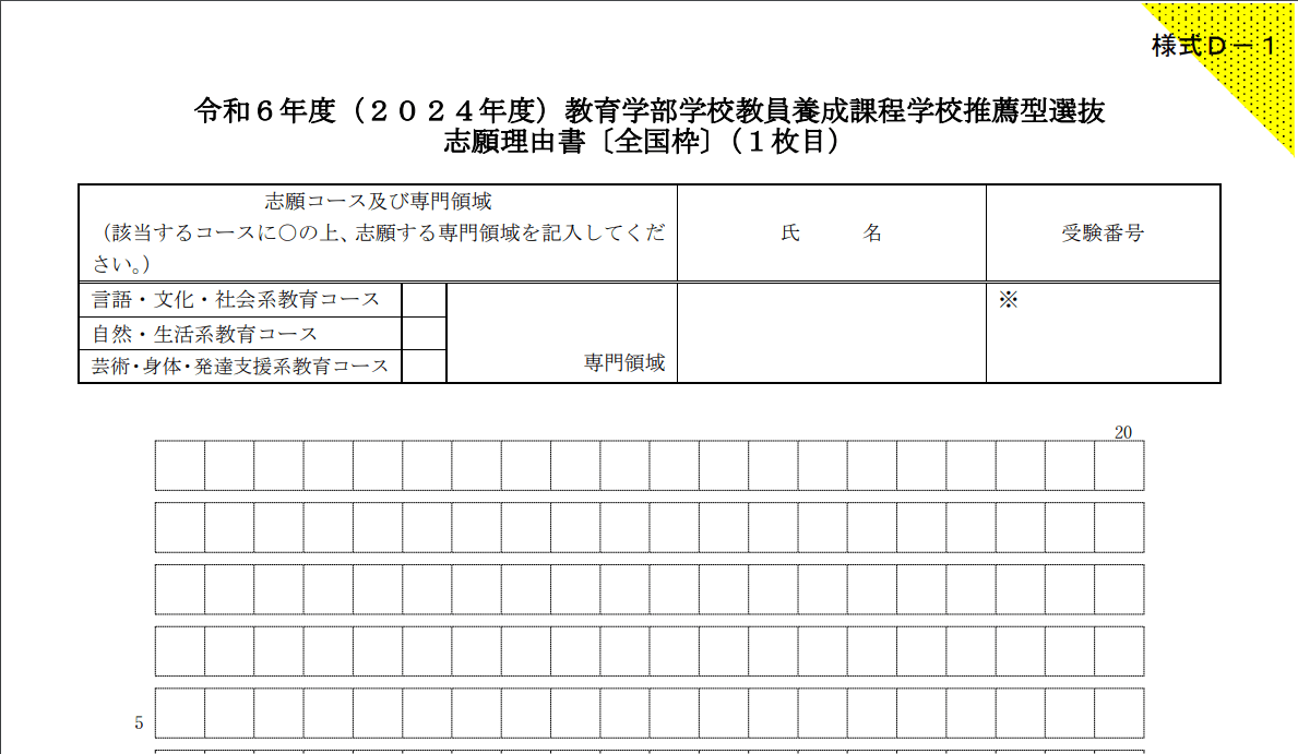 ア.教職を目指す理由、イ.学校推薦型選抜により本学部を志願する理由について、800字以内で所定用紙に自筆で記入します。