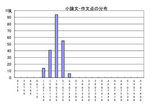 小論文試験は250点満点です。グラフを見ると、8割以上の点数を獲得しているのは全受検者のうち60名程度。面接と同様、小論文試験も上から「2つ目の山(210~239点)」に入ることができれば、合格水準に達すると考えられます。