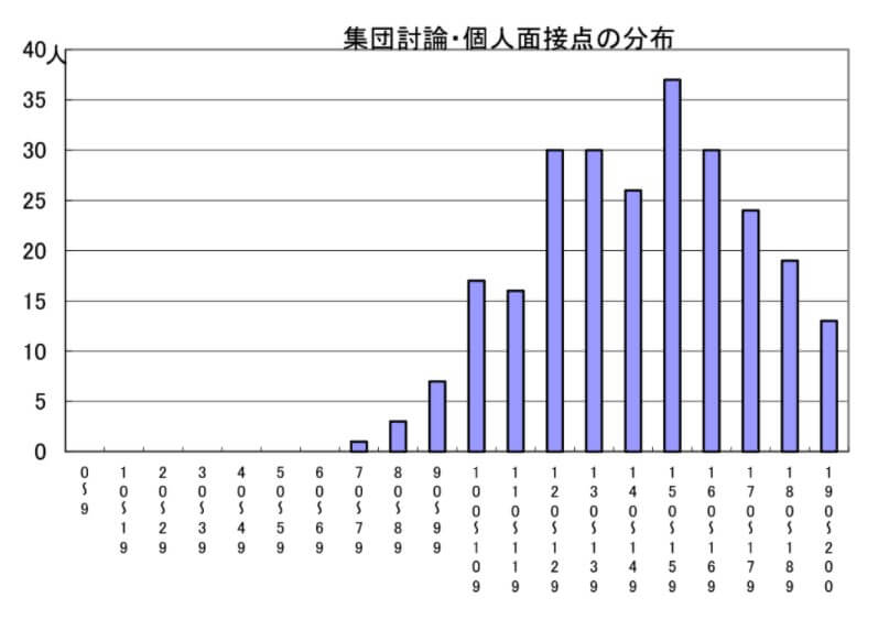 ※上記の表は集団討論の点数も含まれています。集団討論の不実施に伴い、今年度は分布が多少変動する見込みです。また、令和二年度より配点が変更(800点満点中、面接試験は200点満点⇒900点満中、面接試験は150点)となるため、上記は参考値として捉えてください。